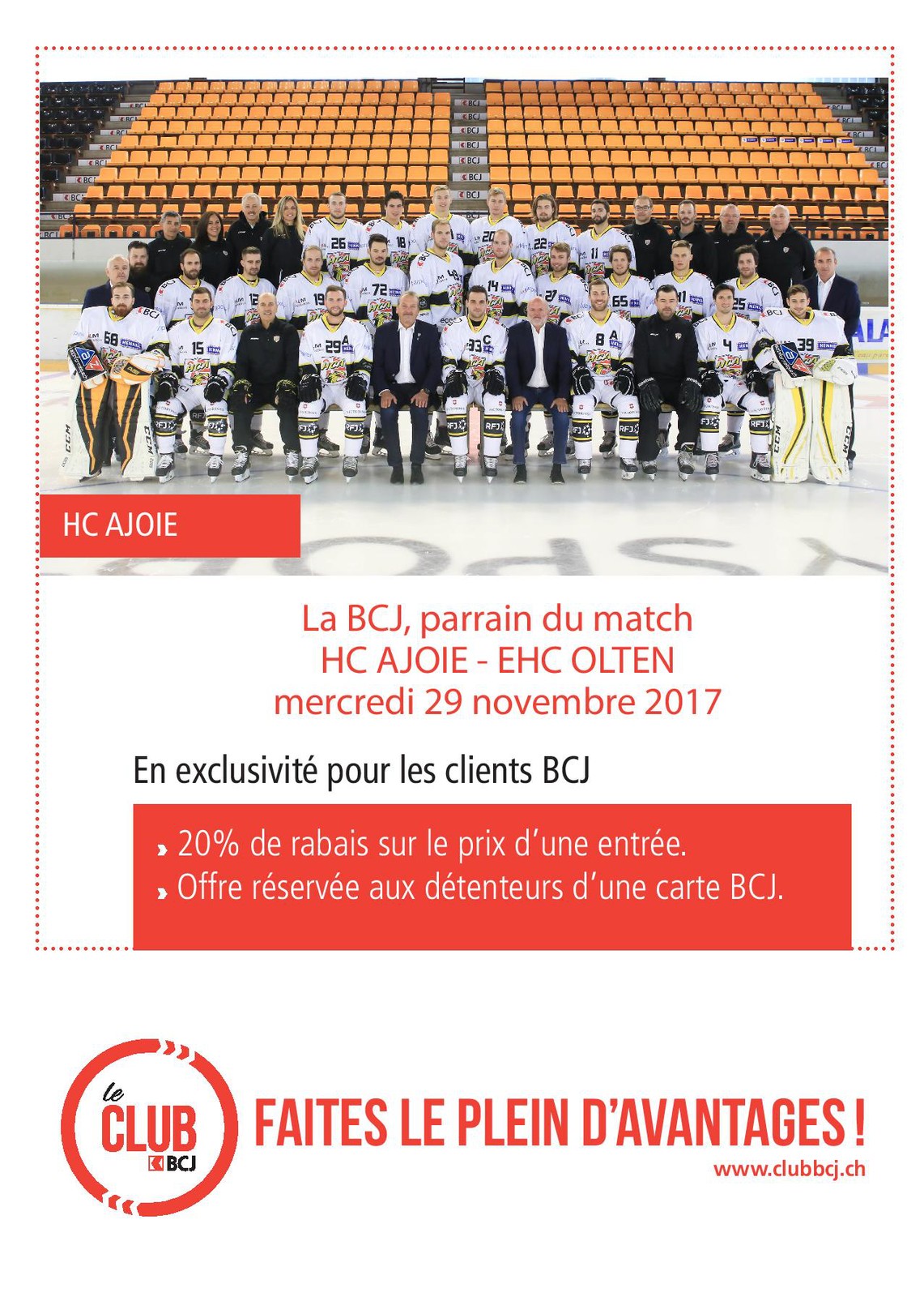 Sur présentation de leur carte de titulaire d’un compte auprès de la BCJ, les supporters bénéficieront d’un rabais de 20% sur le prix du billet à l’occasion du match de mercredi 29 novembre 2017 lors de la venue du EHC Olten !
