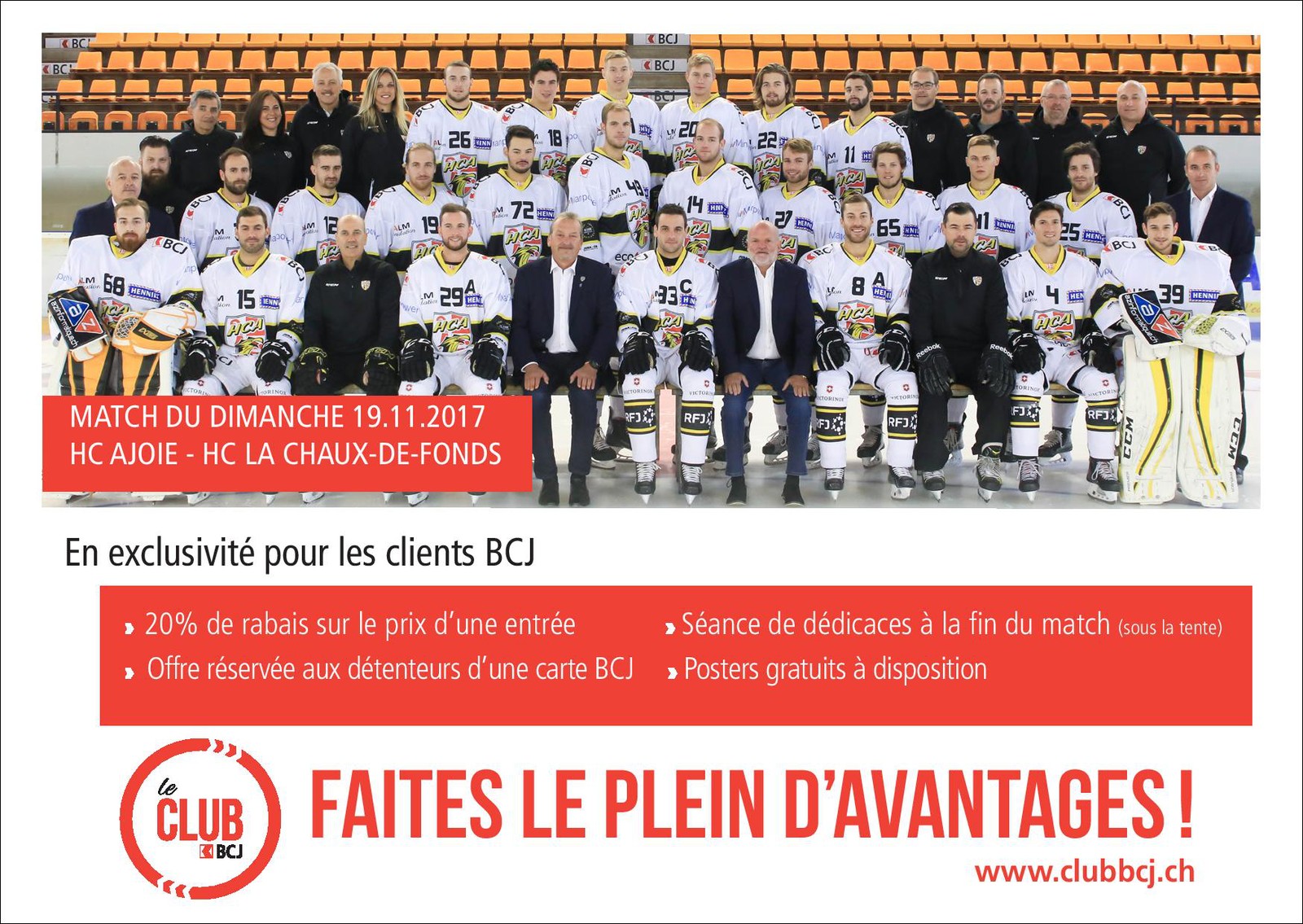 Sur présentation de leur carte de titulaire d’un compte auprès de la BCJ, les supporters bénéficieront d’un rabais de 20% sur le prix du billet à l’occasion du match de dimanche 19 novembre 2017 lors de la venue du HC Chaux-de-Fonds !