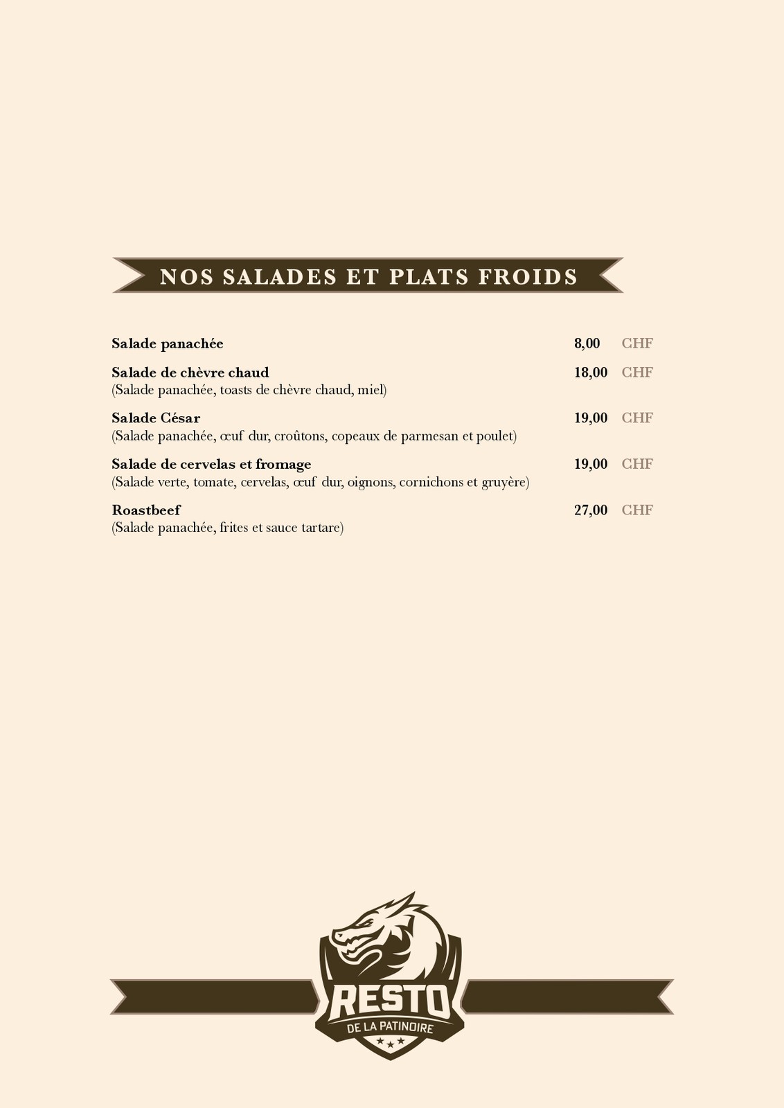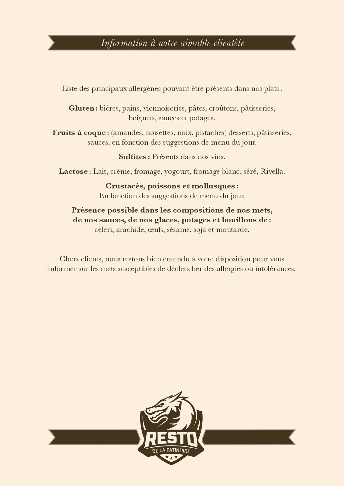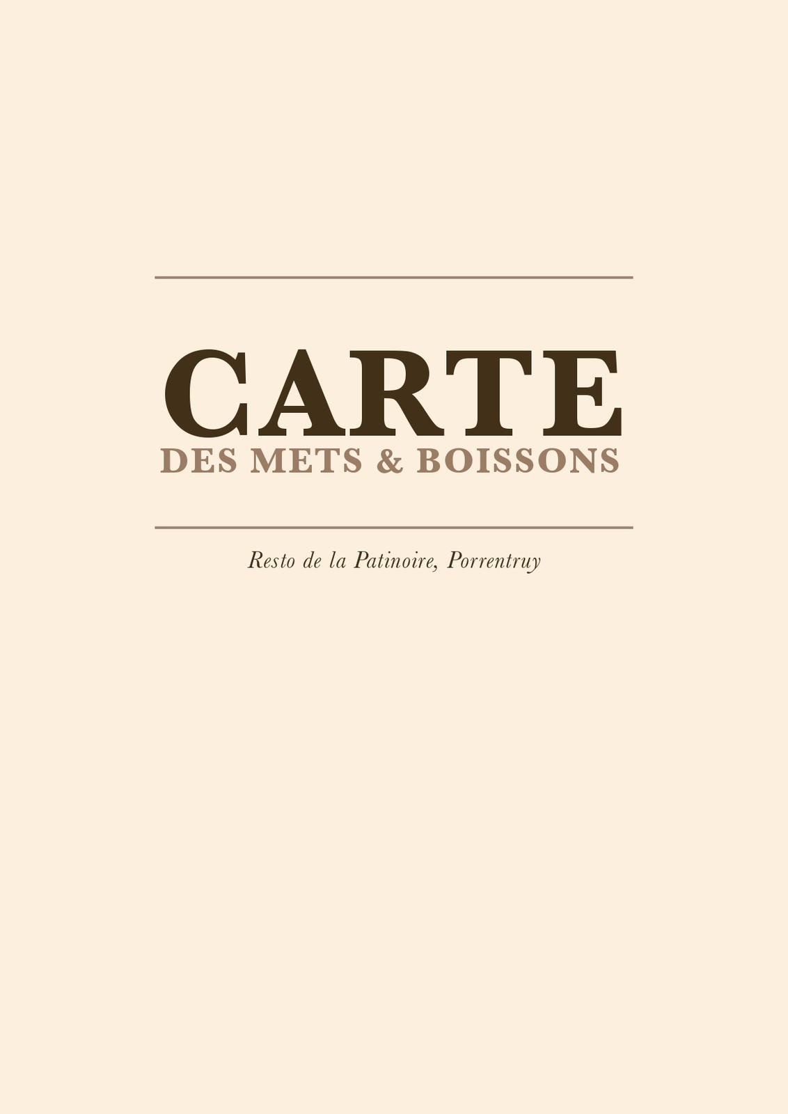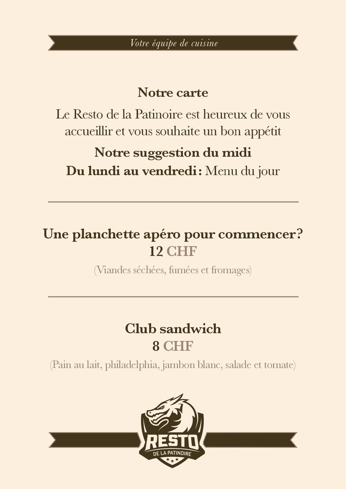 Cartes des Mets et des boissons du restaurant de la patinoire