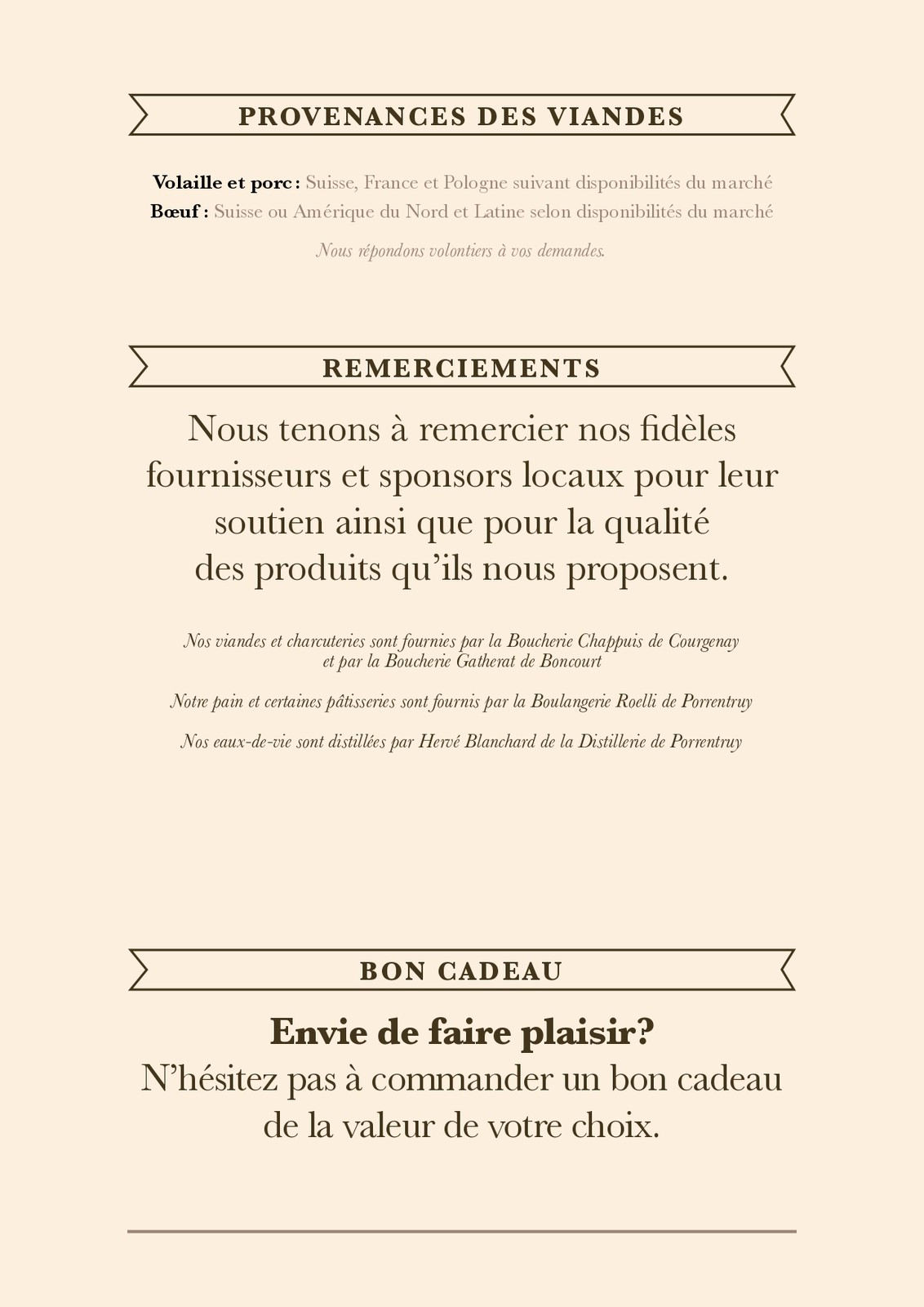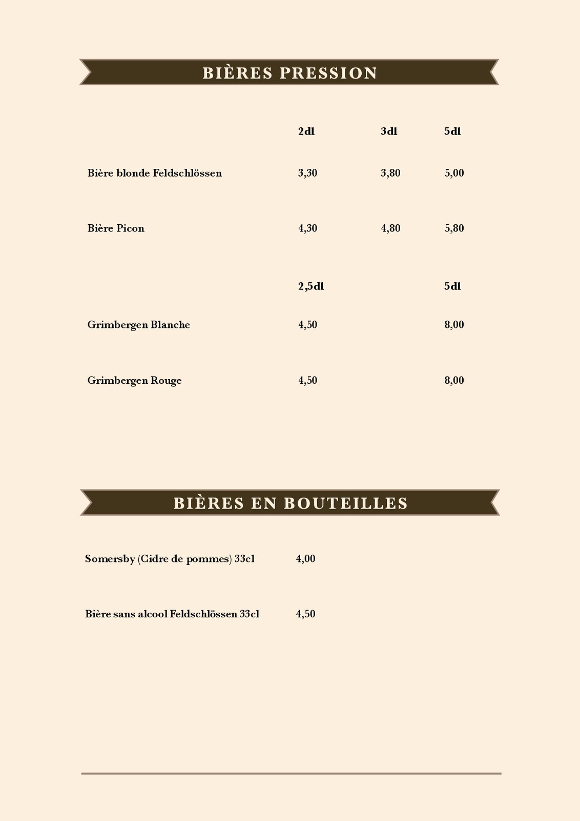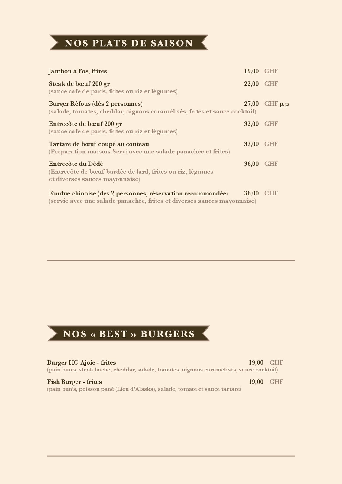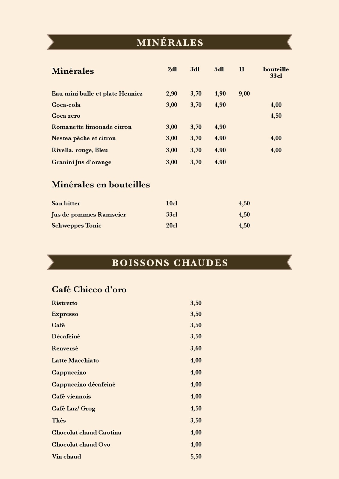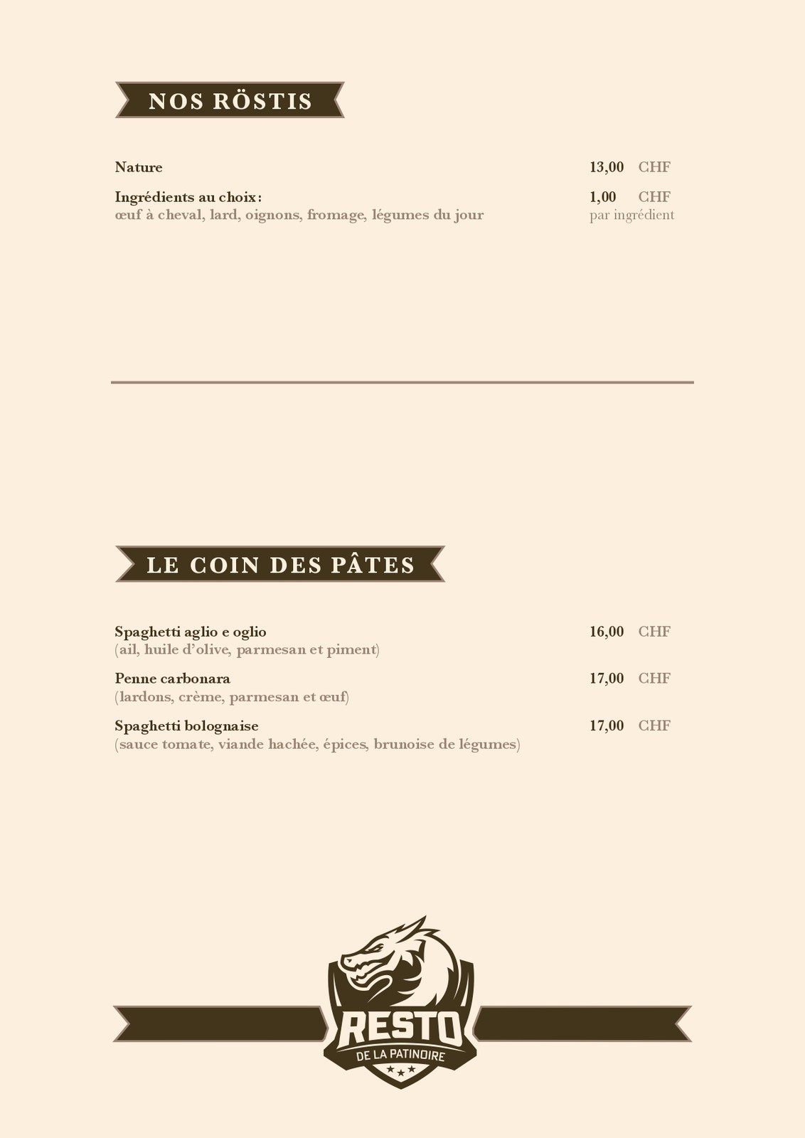 Cartes des Mets et des boissons du restaurant de la patinoire