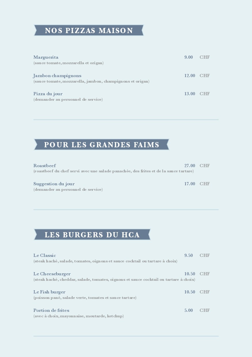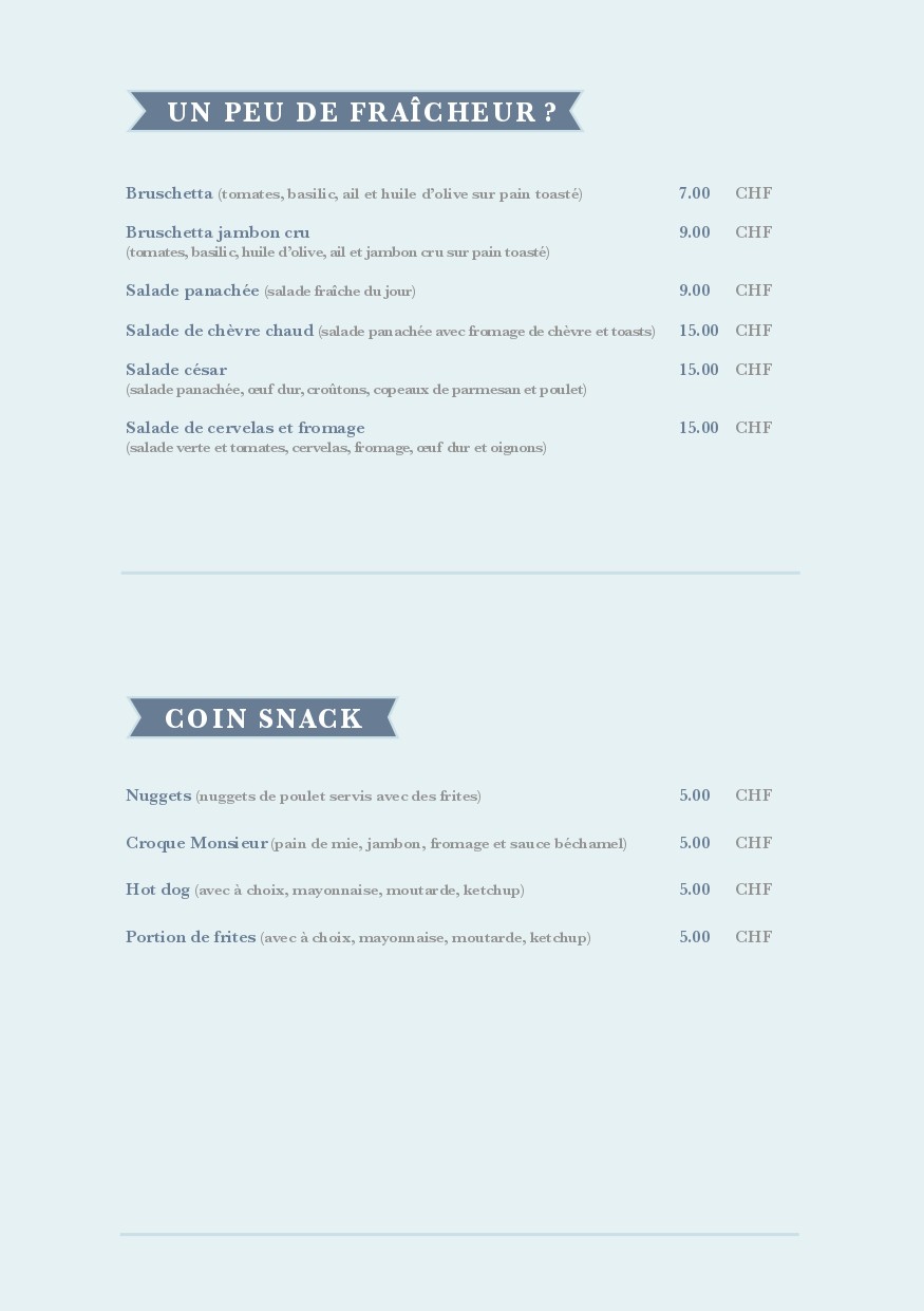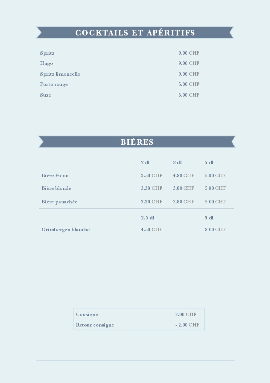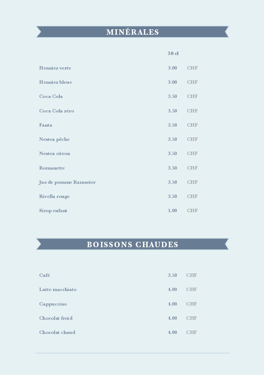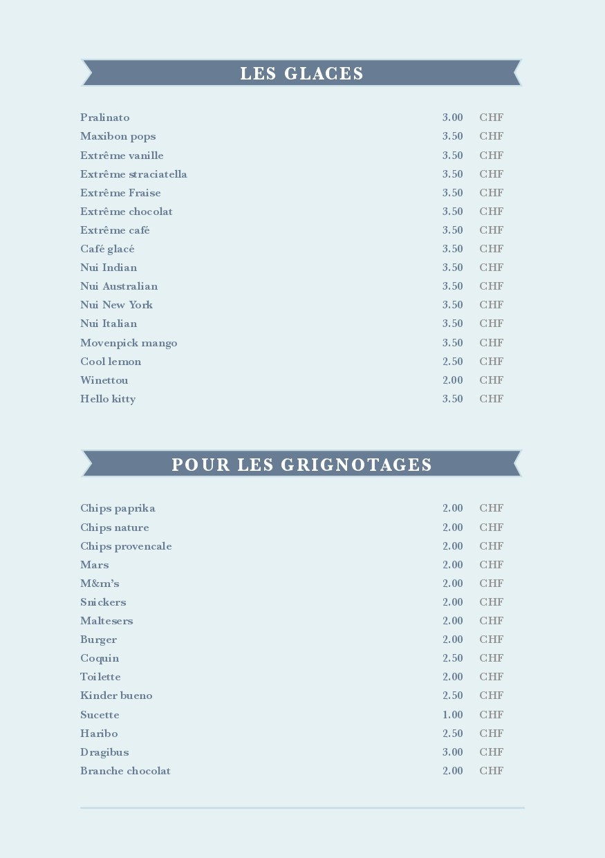 Carte des mets et des boissons de la buvette de la piscine
