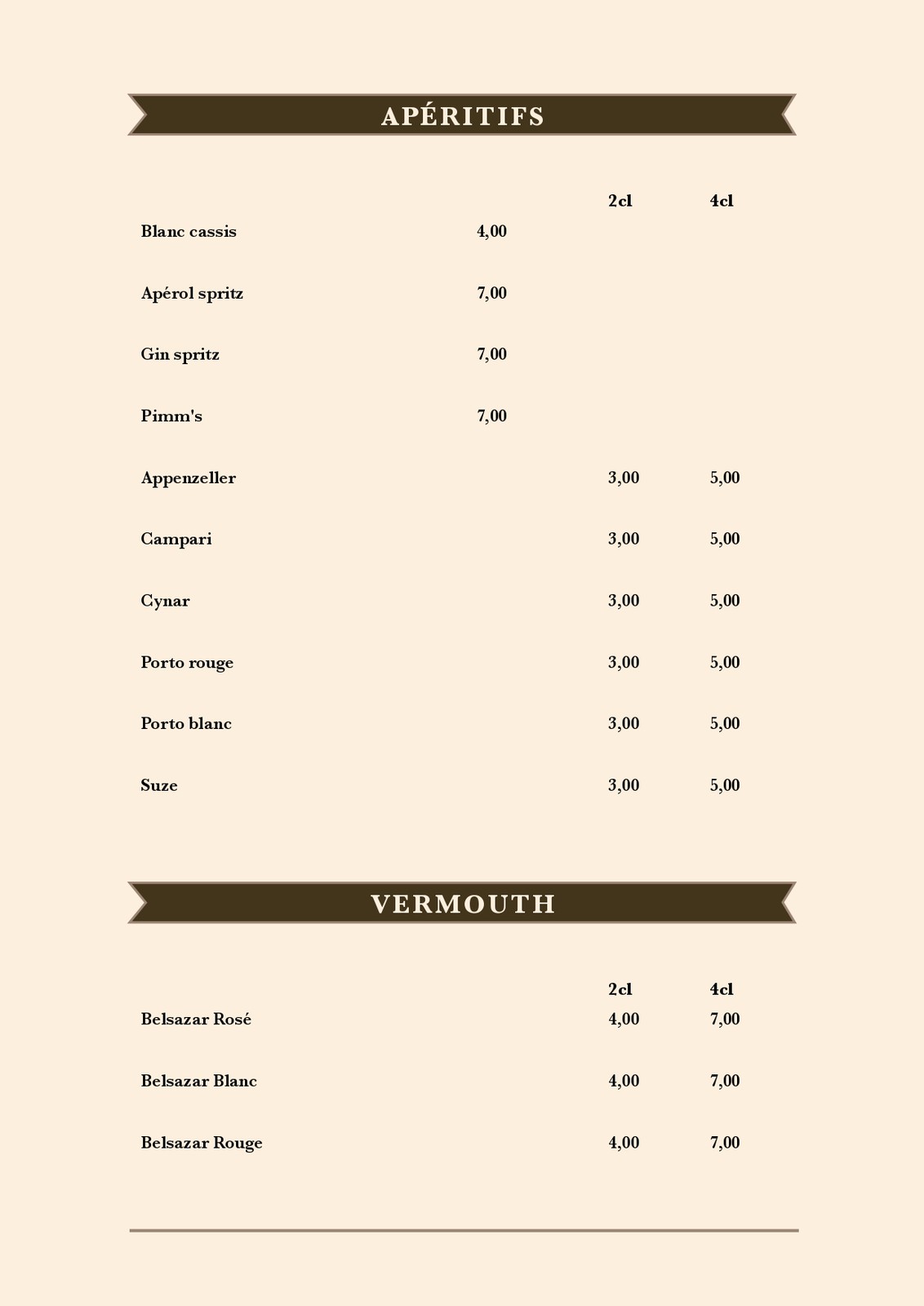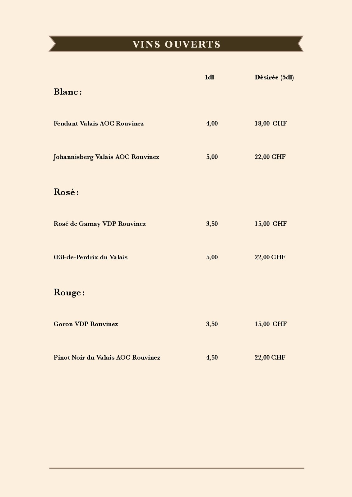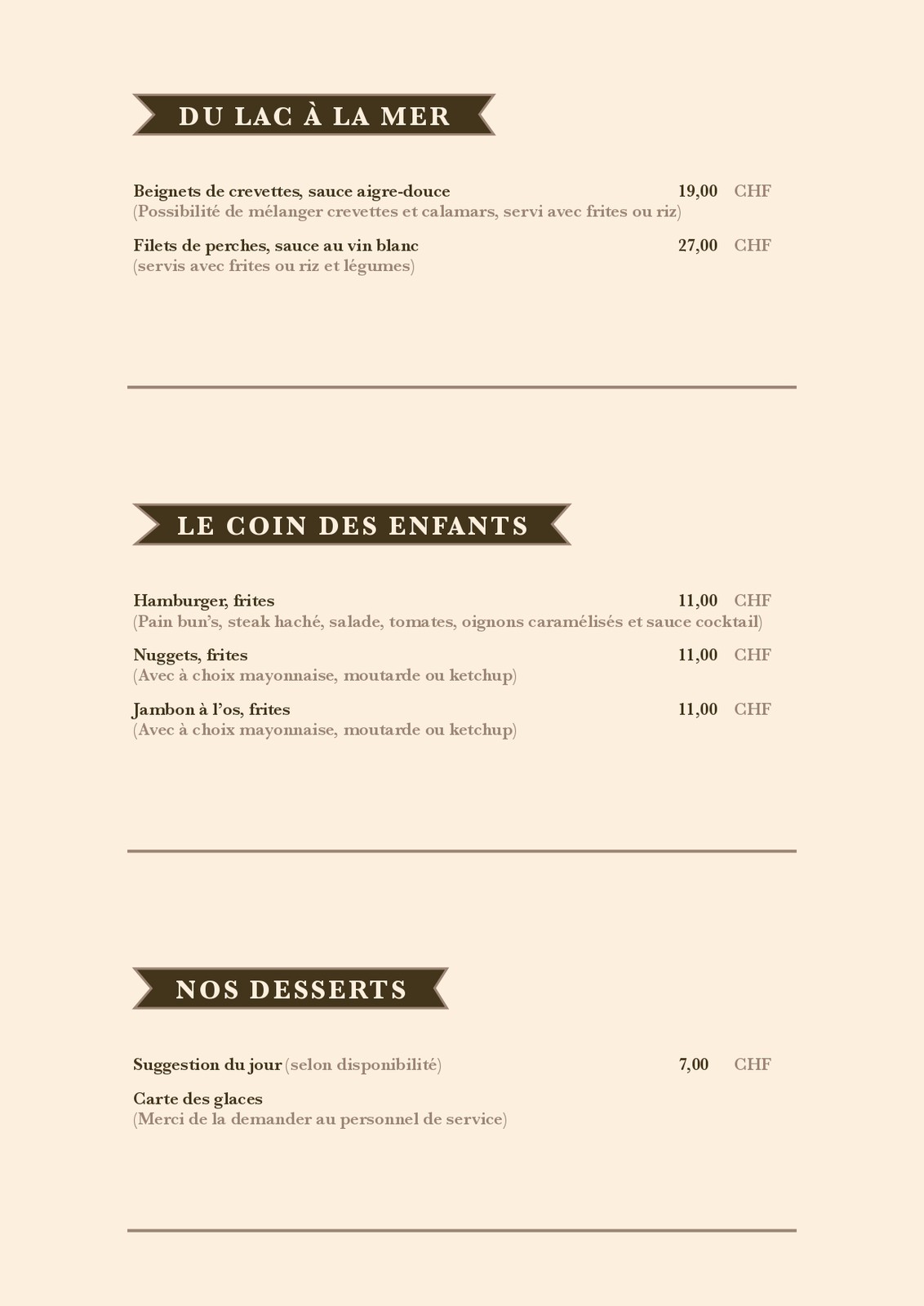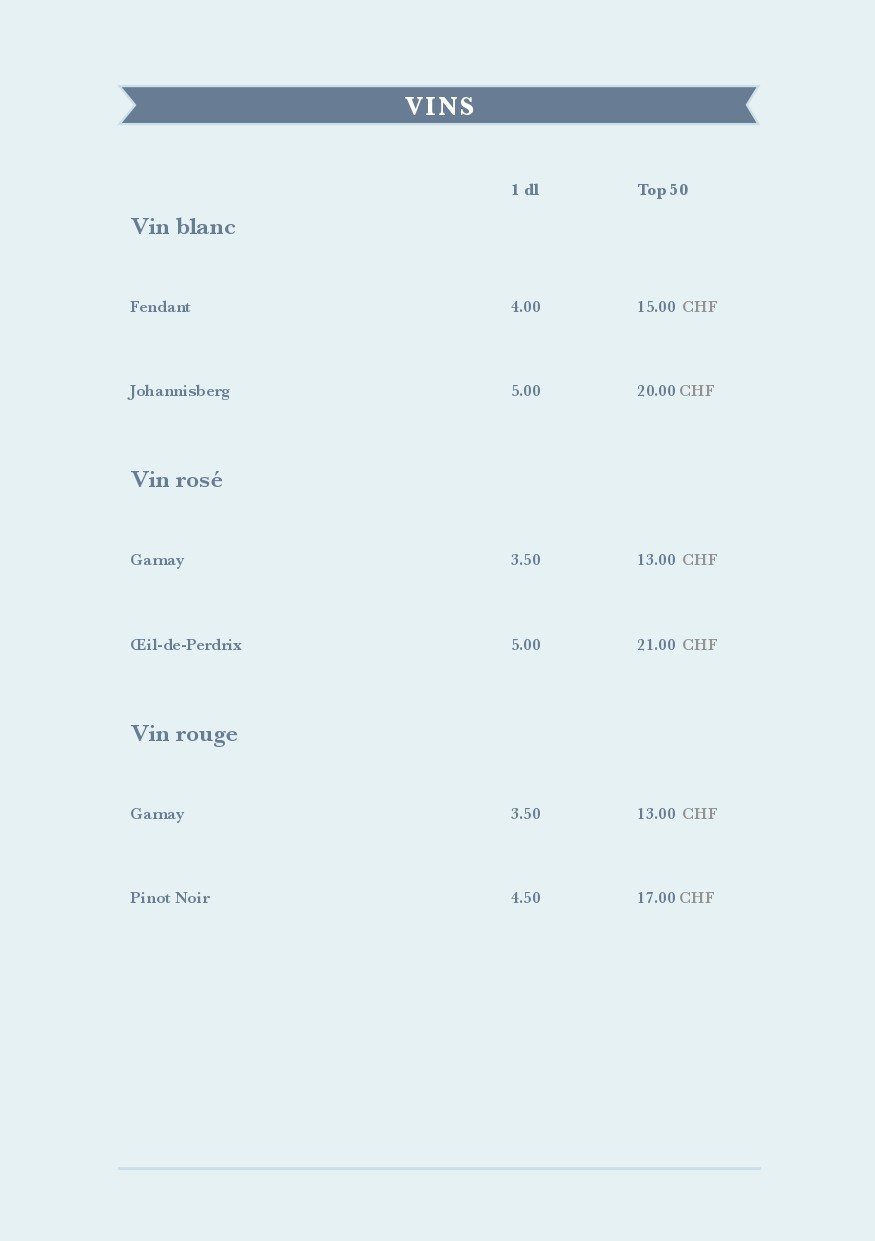 Carte des mets et des boissons de la buvette de la piscine