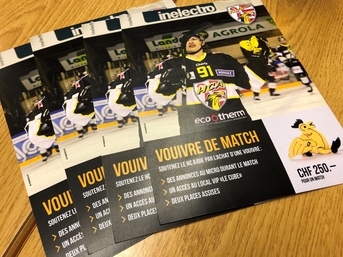 Renseignements auprès du secrétariat du club 032 / 466 54 12 ou par email à info@hc-ajoie.ch ou http://www.hc-ajoie.ch/fr/Soutien/Vouivre-de-match.html